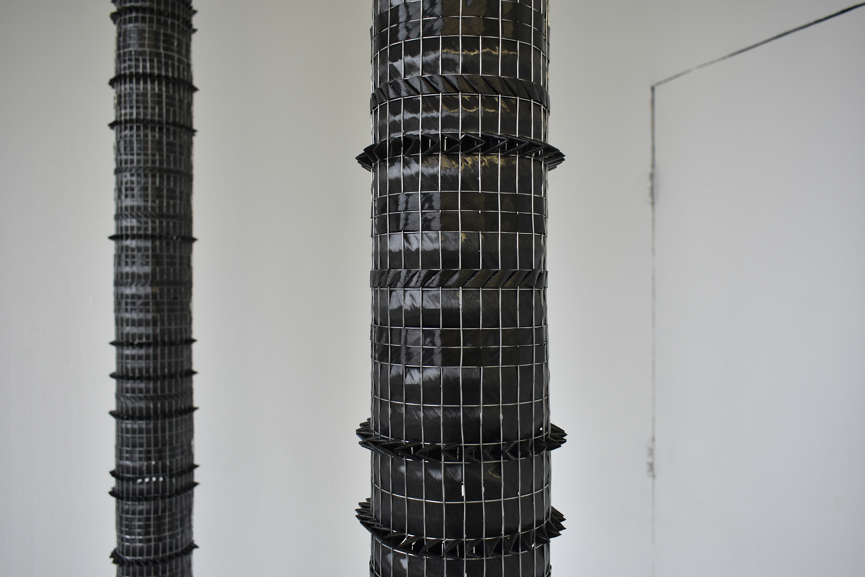 Cylindrical towers are an instrument for measuring the exhibition space, while also expanding it. Burgos’s modular works grow exponentially, interacting and dialoguing with their environment in different ways, from the subtle to the monumental, the static to the dynamic. These towers activate the space by becoming marks, totems, and lines of color that play against the (dis)order of the rural and urban. Meanwhile, Burgos’s flat fabrics contain variations of the same design, accounting for organized and contained space, pointing toward the history of textiles taking us from a space of brightness and saturation to one of black on black. Finally, branches of fallen trees that are almost seamlessly reconstructed soaring to create a space of freedom in contrast to the weight of mathematics.”
