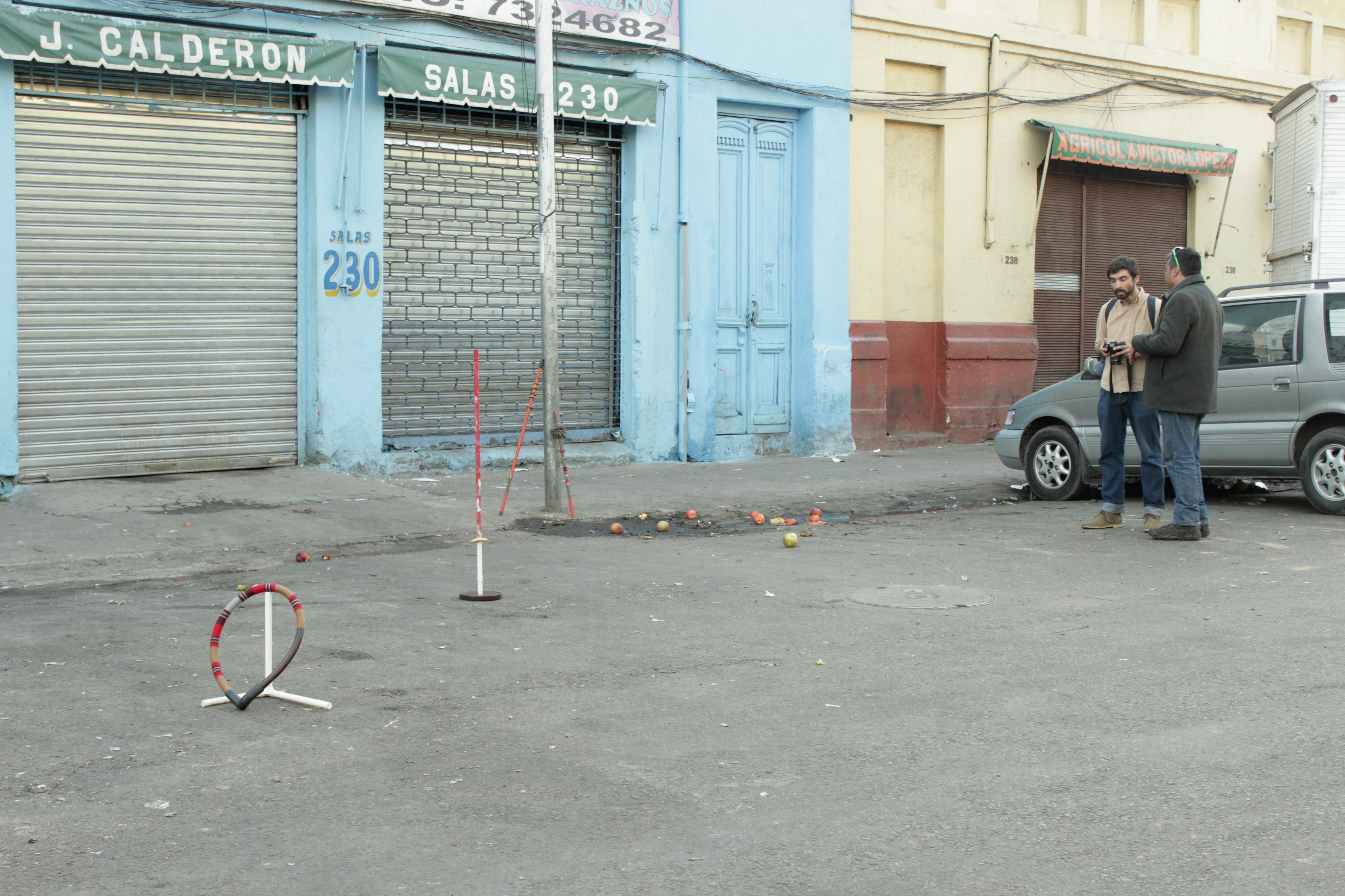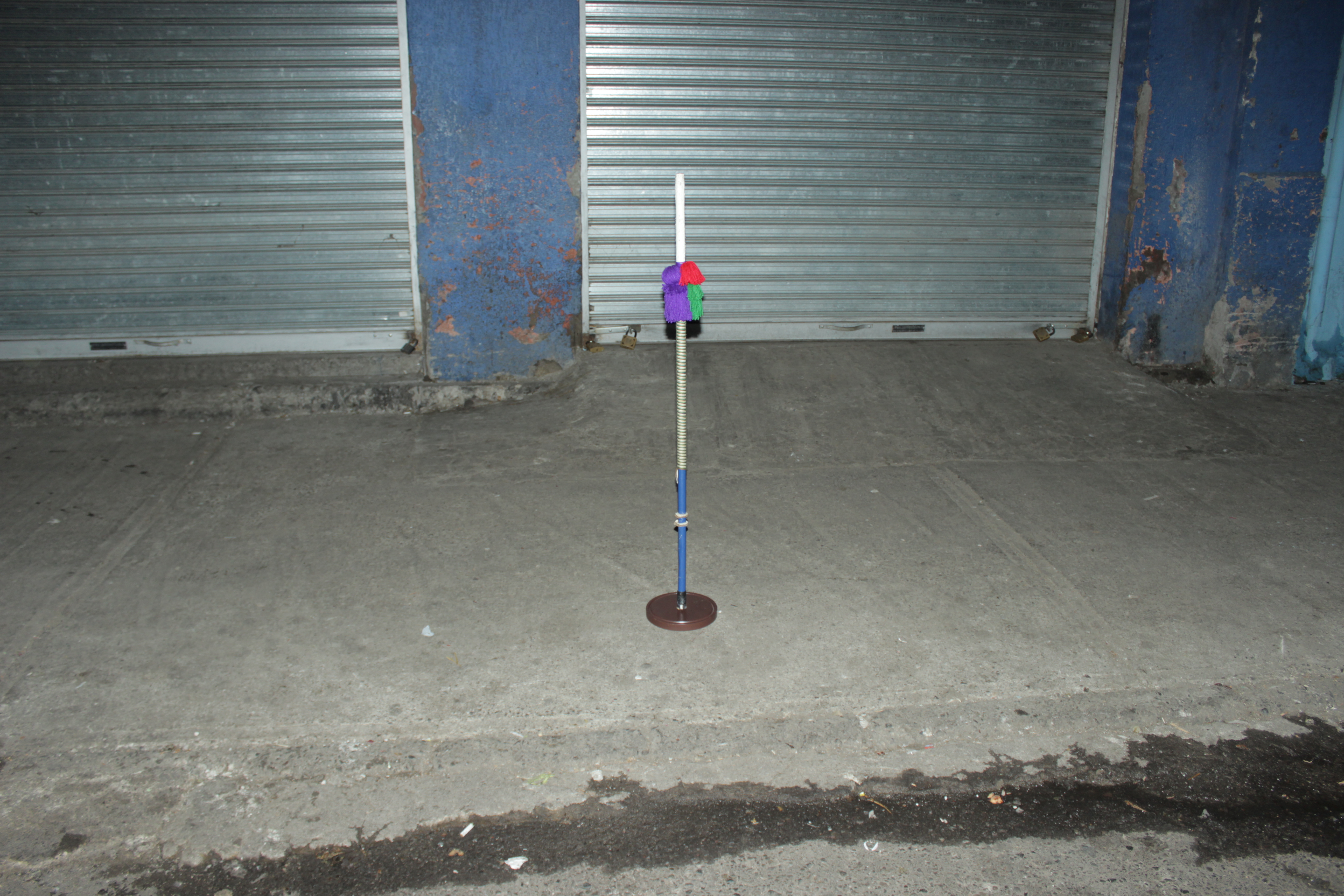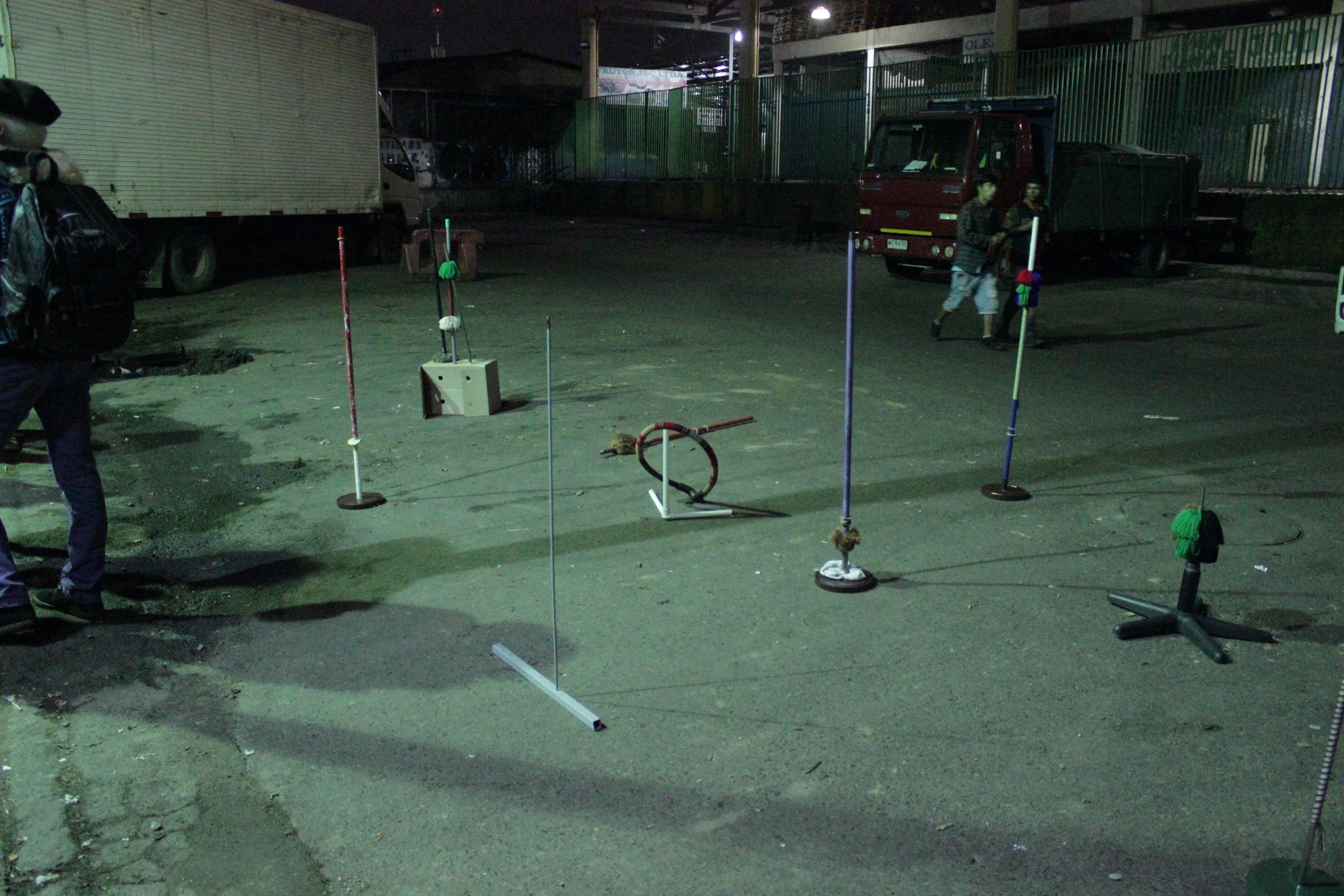 Durante 5 horas a los objetos los voy cambiando de ubicación de acuerdo con las condiciones del lugar el que alberga una gran cantidad de modificaciones del espacio a medida que pasa el tiempo. Hay una segunda condición particular que está alterando el trabajo, ya que tengo que negociar desde el paso de la fuente de luz natural, a una luz artificial que es dada por el alumbrado público.